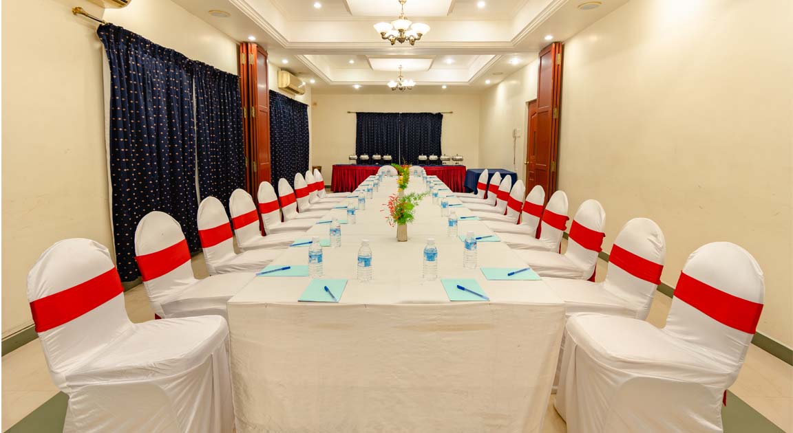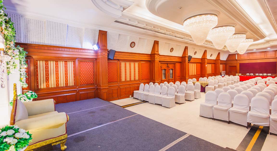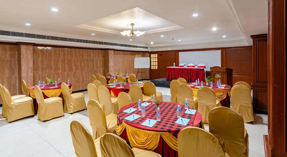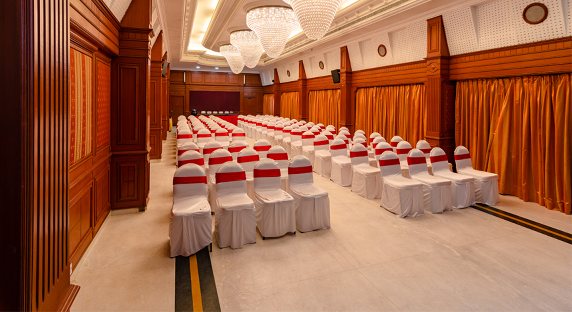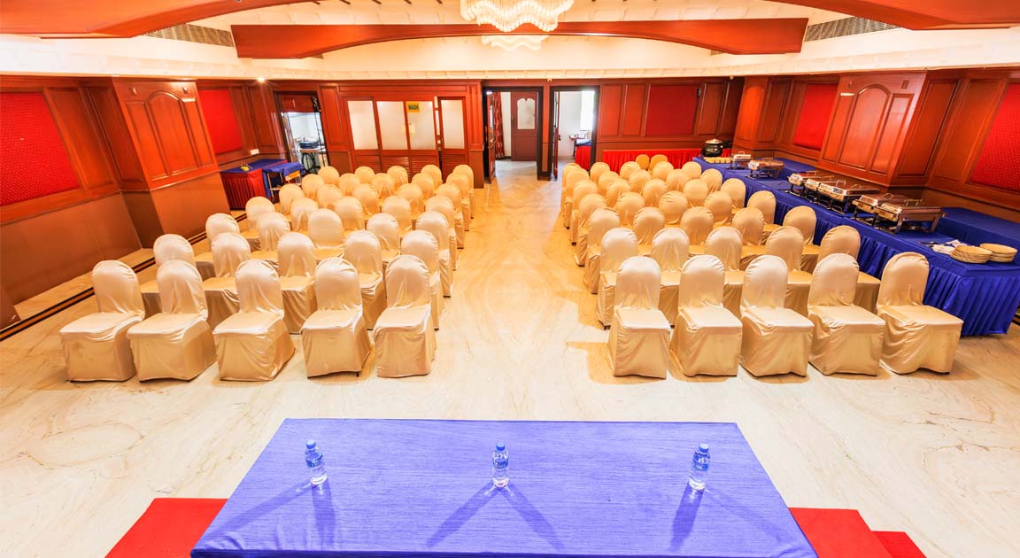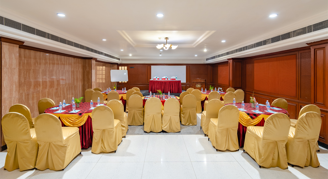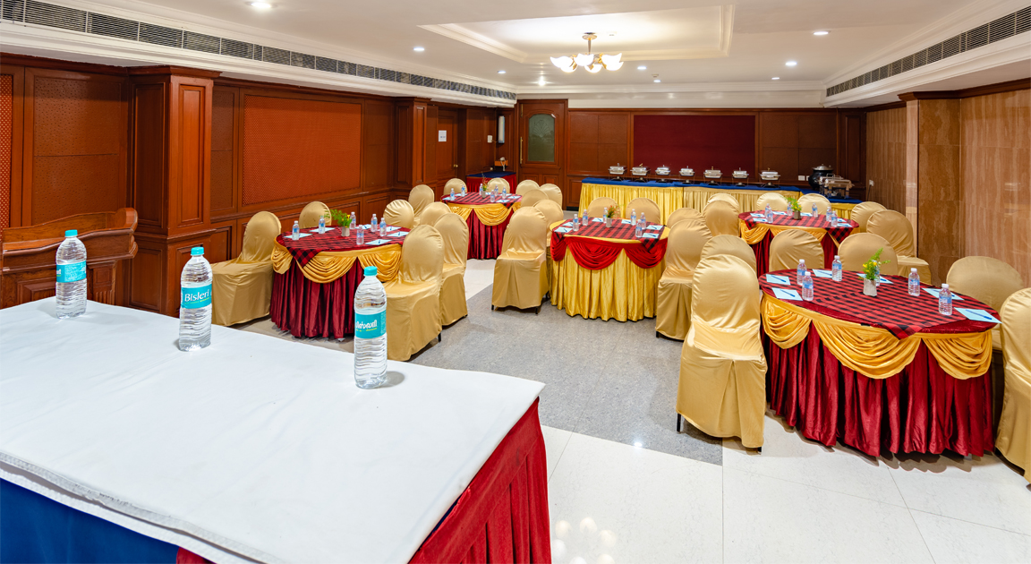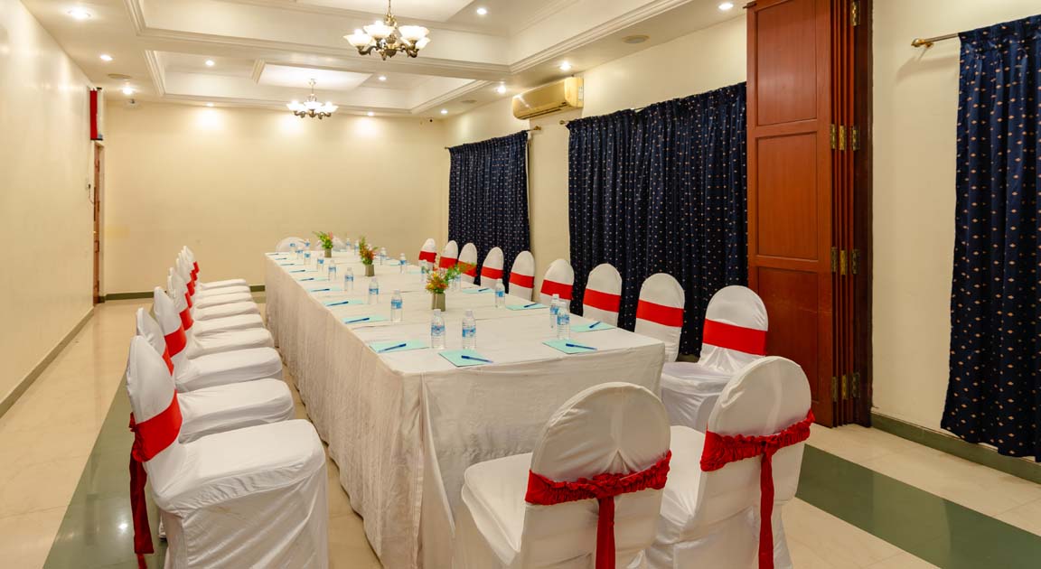 At Hotel Annamalai International, Pondicherry, Prince Court banquet hall showcases exquisite interiors, featuring tastefully coordinated décor, elegant curtains, comfortable seating, and a well-designed stage setup. Equipped with modern amenities and cutting-edge technology, it is an ideal venue for weddings, receptions, birthdays, conferences, and private parties. The hall can comfortably accommodate 50 to 250 guests, offering versatile seating arrangements such as floating crowd, theatre, U-shaped, cluster, classroom, boardroom, and more — ensuring a perfect setting for any occasion.